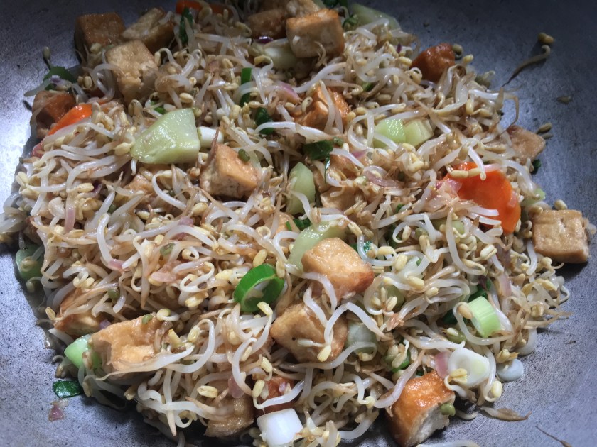 Fry the tofu until golden brown then set aside. In a pan, sauté onion and garlic in coconut oil. Add the fried tofu. Add water, soysauce, sugar, salt and pepper. Mix in the mungbean sprout wait until it simmers. Add the sayote and carrot. Mix everything. Simmer for 2 minutes then add onion leeks. If you want to thicken the sauce, just add cornstarch dissolved in 1/2 cup water.