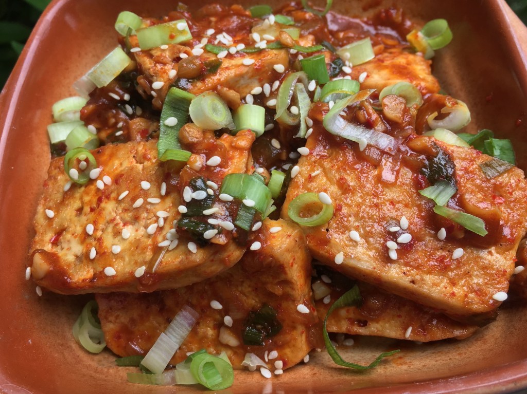 1 pack tofu/tokwa, sliced into desired cut 3 tbsp garlic, minced 1/2 cup red onion 1/2 cup onion leek, chopped 1 tbsp coconut or olive oil 2 tbsp soysauce 1 tsp sugar 1/2 tsp salt 1 tbsp hot pepper flakes 1/2 cup water 1 tsp roasted sesame seed (optional)